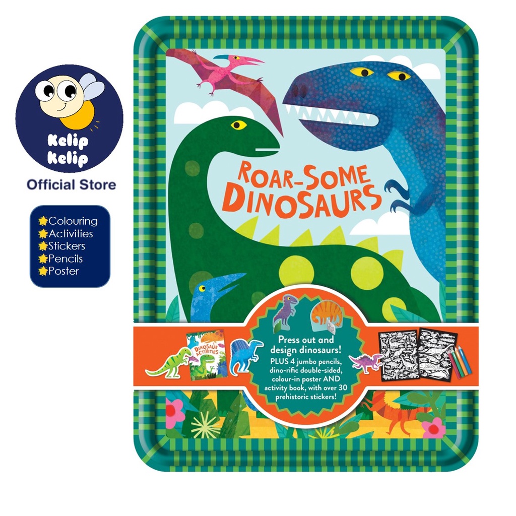 Dinosaurs Happy Tin Gift set with English Activity Book 50 Stickers 4 Jumbo Pencils Poster for Kids